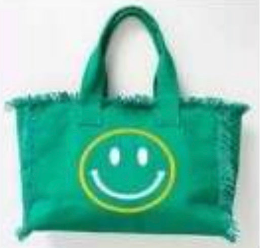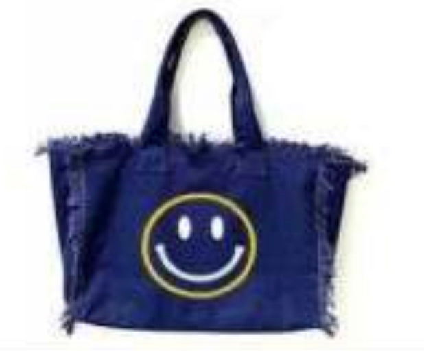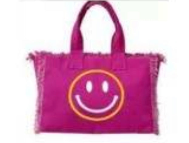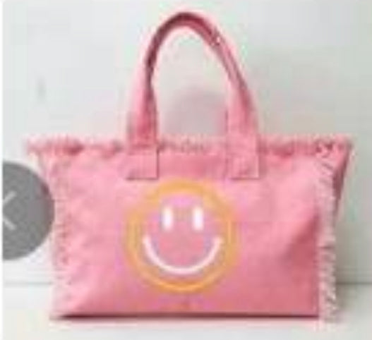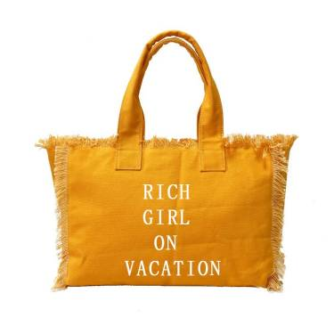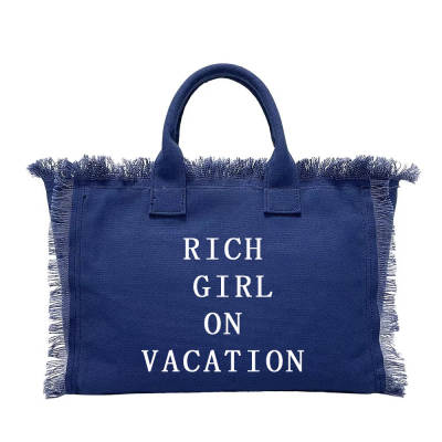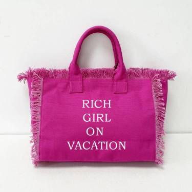Rich Girl on Vacation tote canvas fringe with inside zipper. Fashion forward and Chiqui for the perfect rich girl on vacation! One side graphic Rich Girl on Vacation other side happy face with fringe.